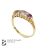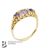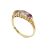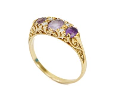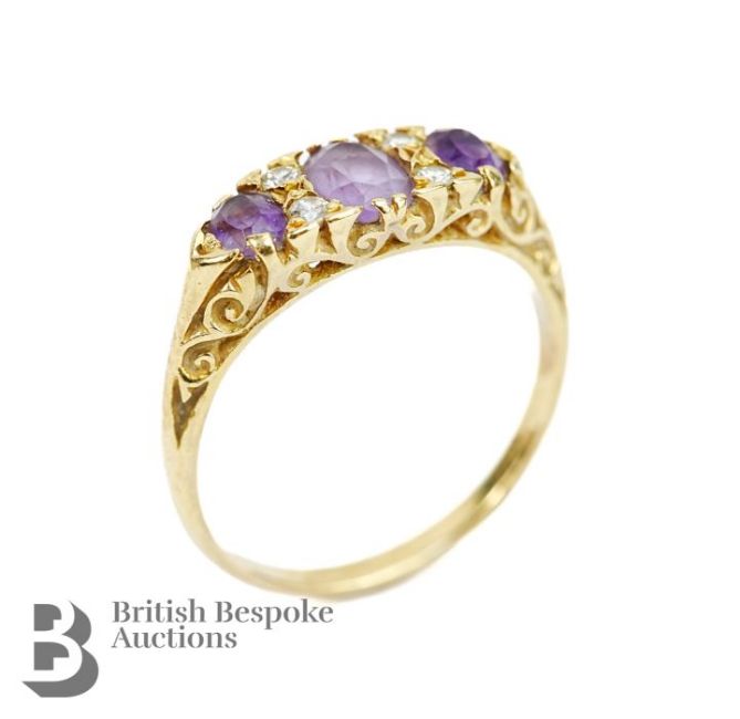 18ct yellow gold and amethyst ring. The ring set with an oval amethyst approx 6 x 4mm, flanked by two further amethyst 4 x 3mm each, and approx 8 pts of dias, size S, approx 4.4 gms.