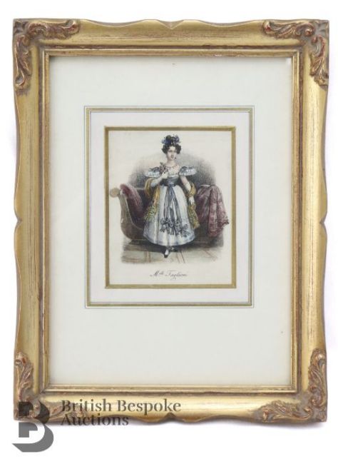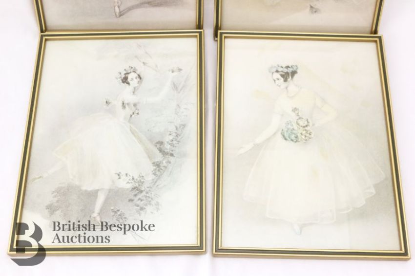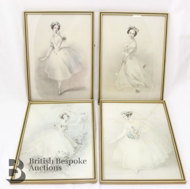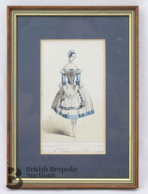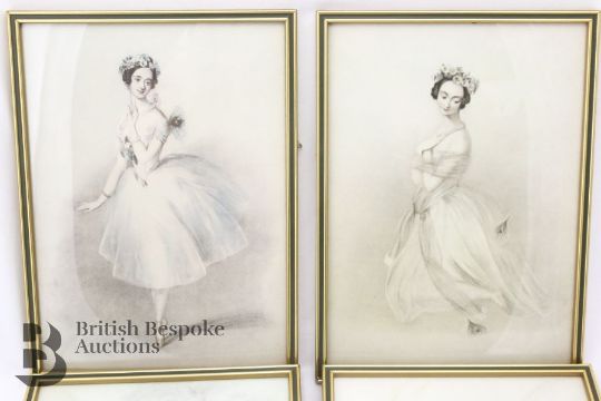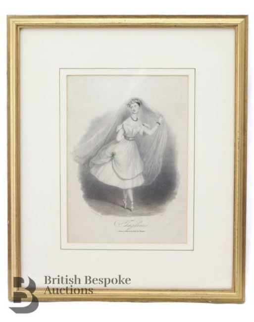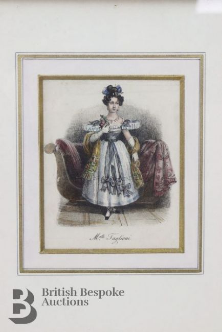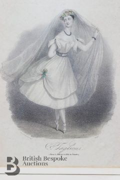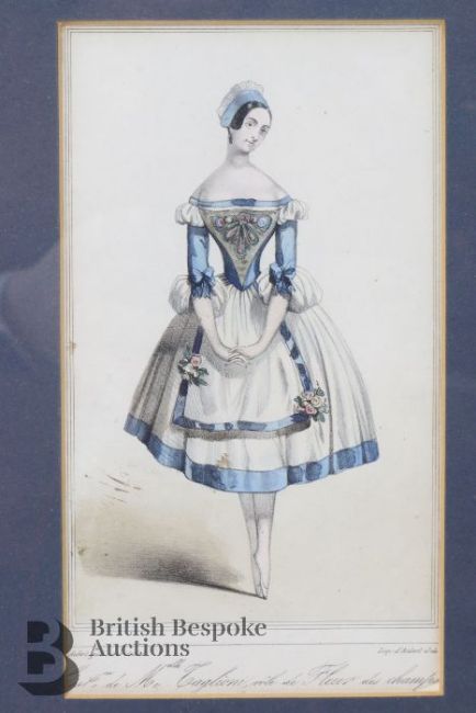 Marie Taglioni (1804-1884) in four scenes from La Sylphide (1832) choreographed by Filippo Taglioni of important scenes from the ballet approx  cms, together with Marie Taglioni in La Fille du Danube (1836) choreographed by Filippo Taglioni, approx   cms, framed and glazed; Marie Taglioni colour portrait print, framed and glazed, approx. cms; and Marie Taglioni in the role of Fleur des Champs print, framed and glazed, approx. cms.