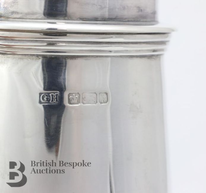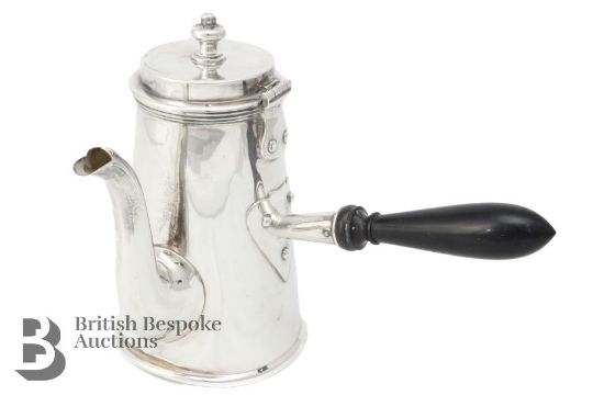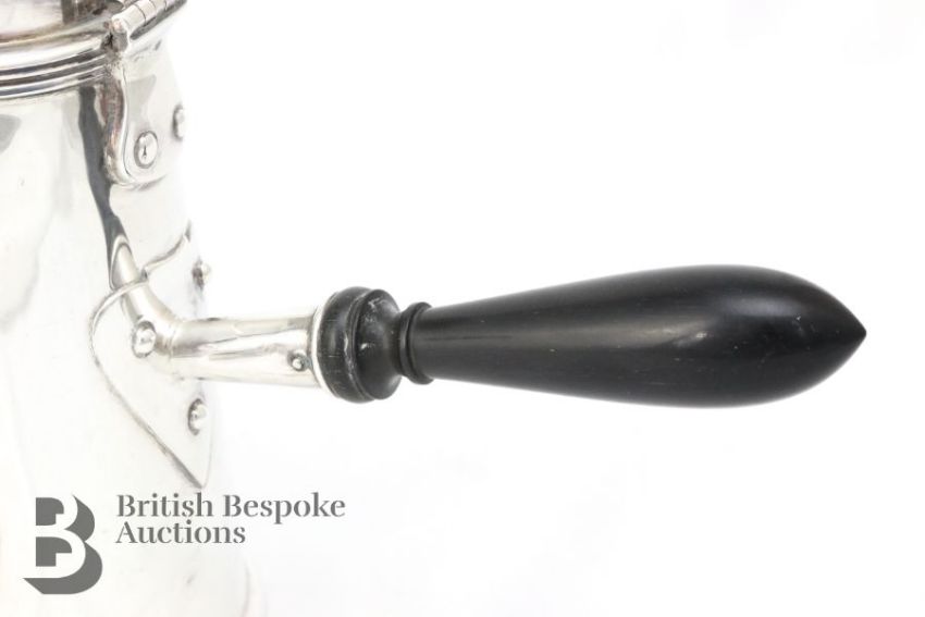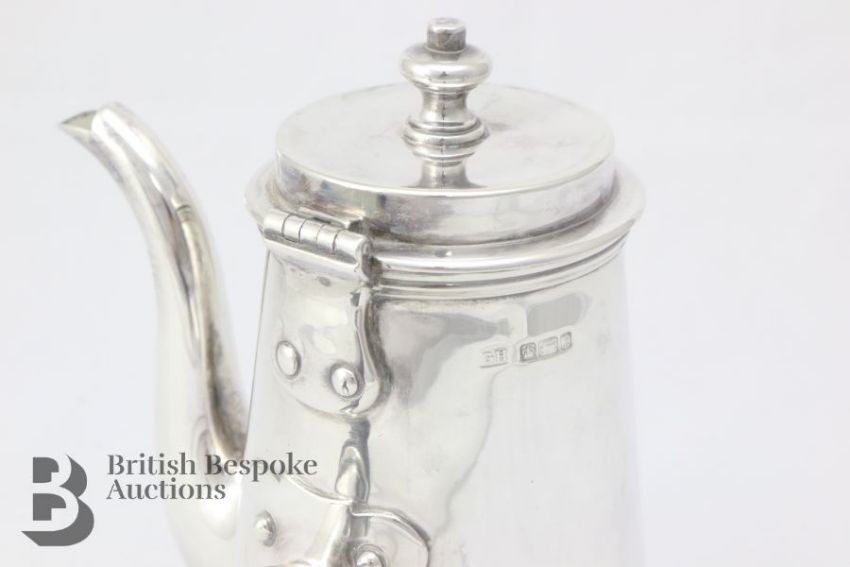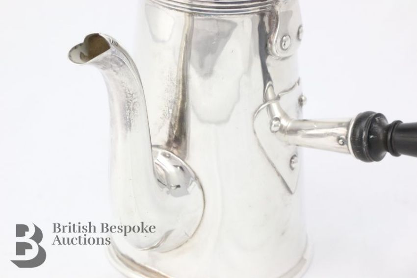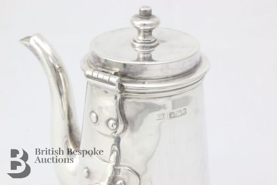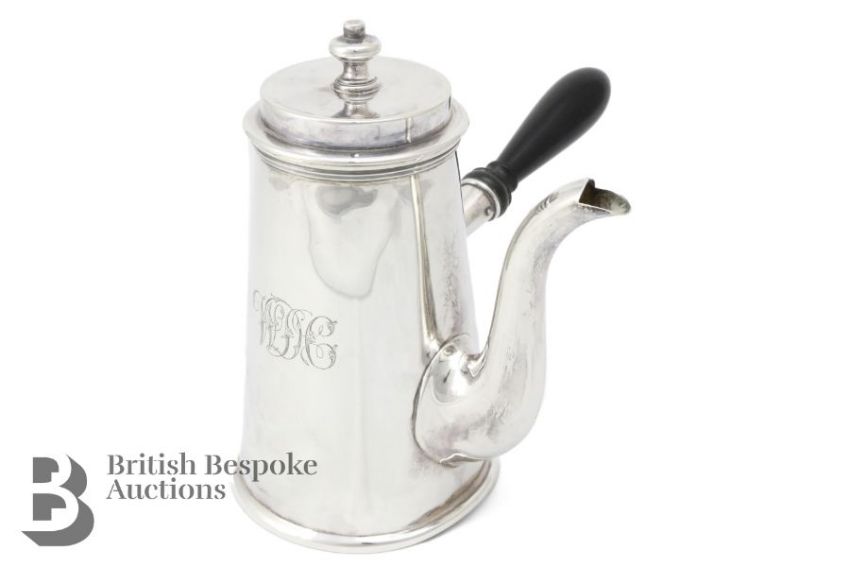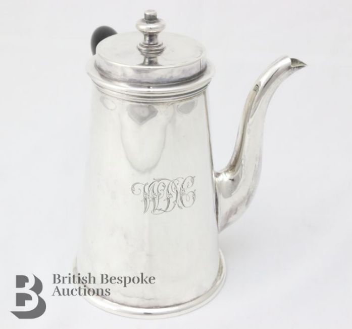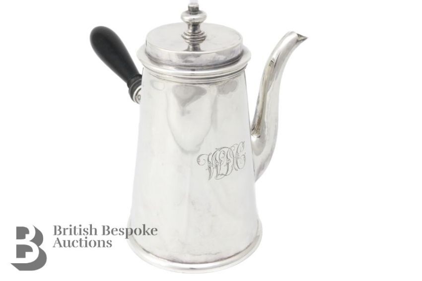 An Edwardian silver coffee pot, of tapering cylindrical form, with hinged lid and knopped finial, part turned wood side handle, Sheffield hallmark dated 1902, mm Harrison Bros & Howson, monogrammed WDC gross weight 355 gms.