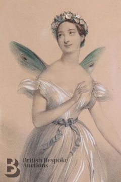 19th century ballet half partial colour lithograph of Marie Taglioni in Sylphide by de Cattier after a drawing by Déveria, published in Paris, approx 31.5 x 46 cms, framed and glazed. Provenance: from the collection of the Late Sir Frederick Ashton O.M, C.H, CBE sold 30th June 1993, later property of a Yorkshire lady.  Condition Report Some general browning conducive with age, some fading to colour.