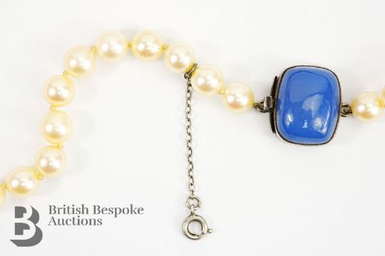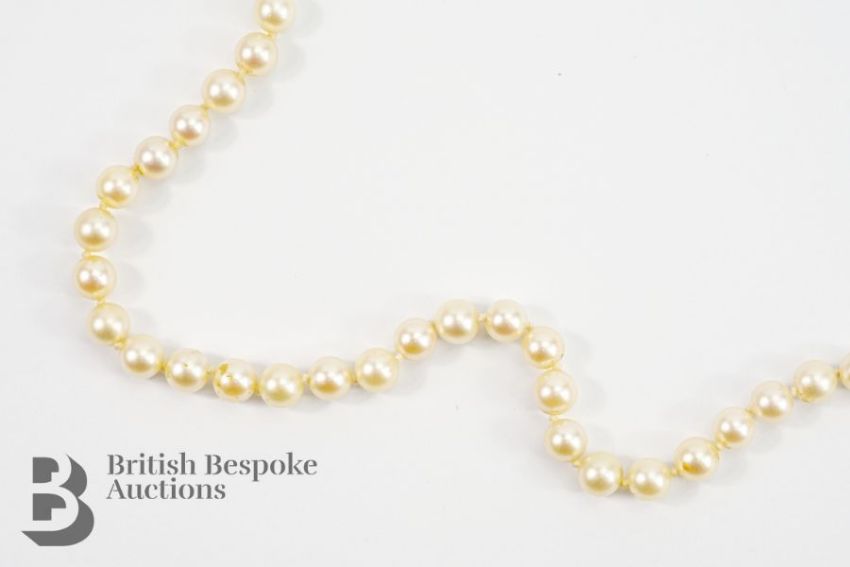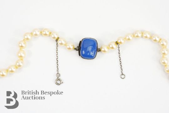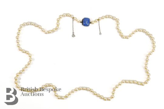A string of cultured pearls, 78 cms, each pearl approx 6mm, 109 pearls, on a 9ct gold, silver and blue stone clasp stamped Sybil Dunlop.
