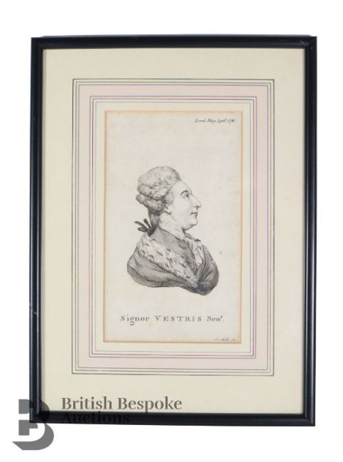 This lot includes a print of Monsieur Vestris Senior, by J.Miller, published in London April 1781, approx 10w x 18 h cms and another of Monsieur Vestris Junior, published London April 1781, approx 9.4 x 14 cms, both framed and glazed.