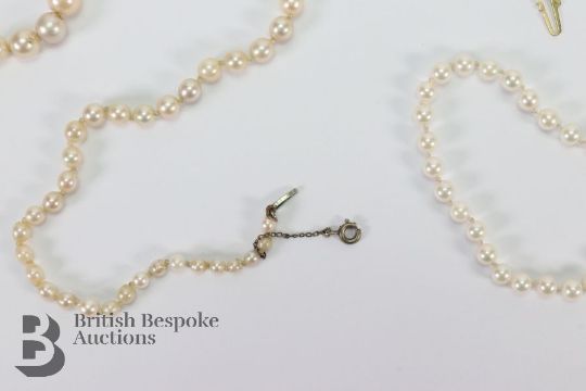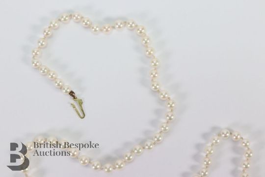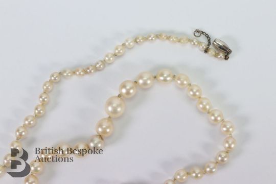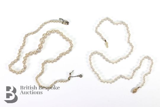 A single strand pearl necklet, pearls measure 4-4.5mm, 41 cms, held by a gold safety clasp stamped 14k. This lot includes a graduated pearl necklet, measuring 7.78mm to 2.88mm, held by a small torpedo clasp and safety chain approx 44 cms. (2)