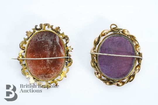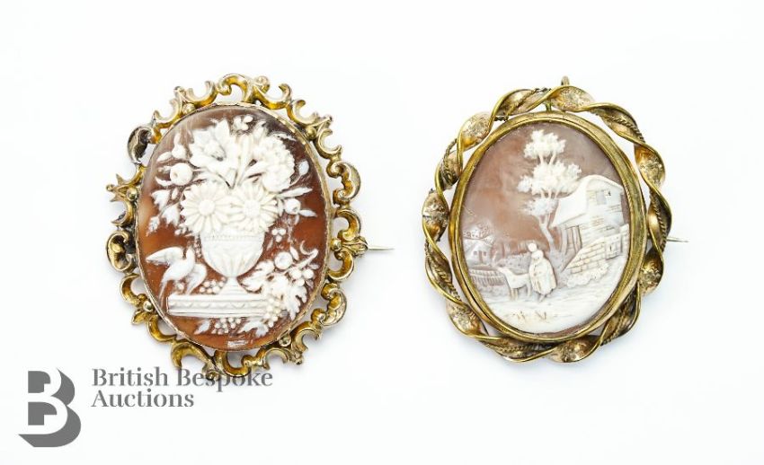 Antique shell cameo brooch, depicting a jardiniere of flowers with dove, approx 45 x 35mm and another shell cameo mourning brooch depicting a figure in a garden with her dog approx 40 x 30mm.