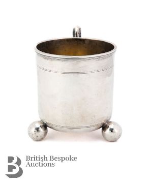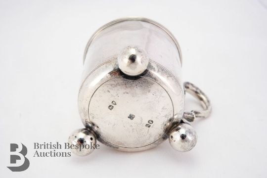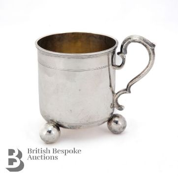 Victorian silver christening mug, London hallmark dated 1871, mm Daniel and Charles Houle, approx 194.5 gms. The christening cup of simple form with c-scroll handle supported on three ball feet.