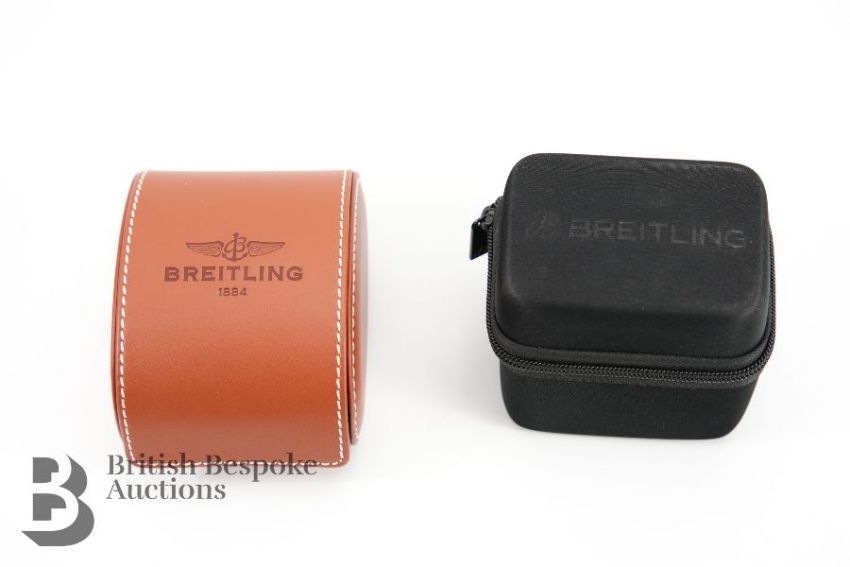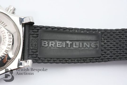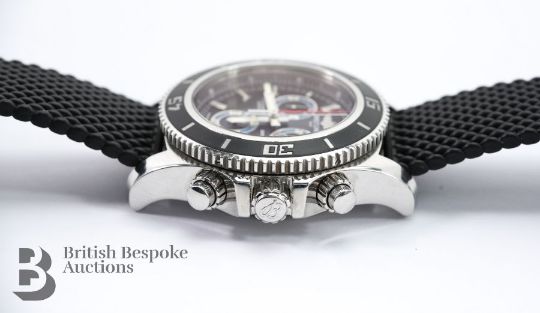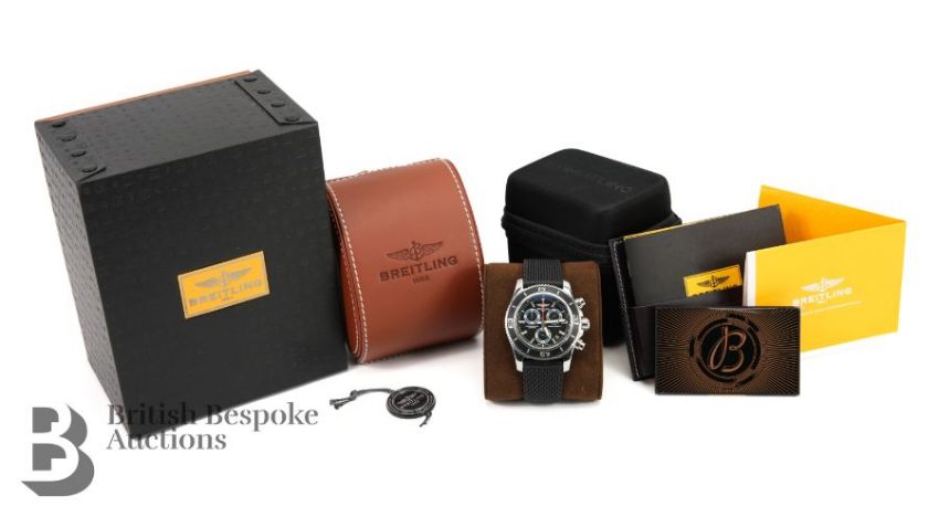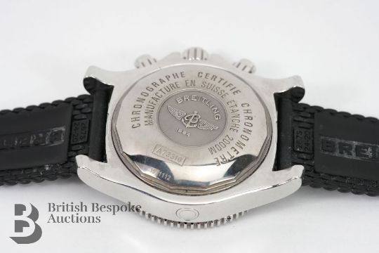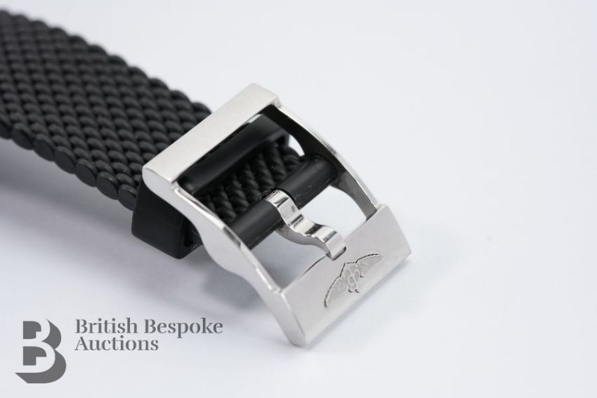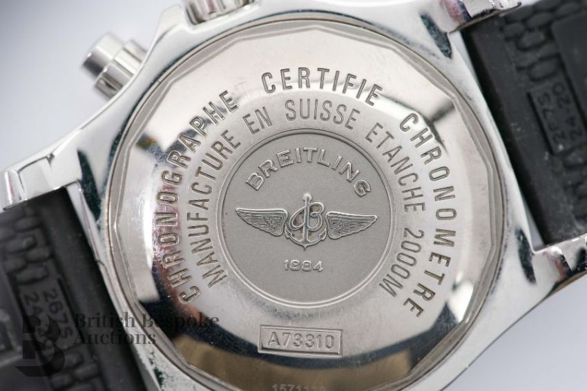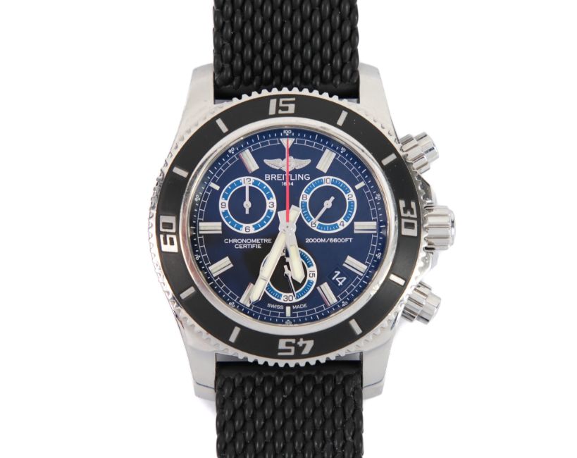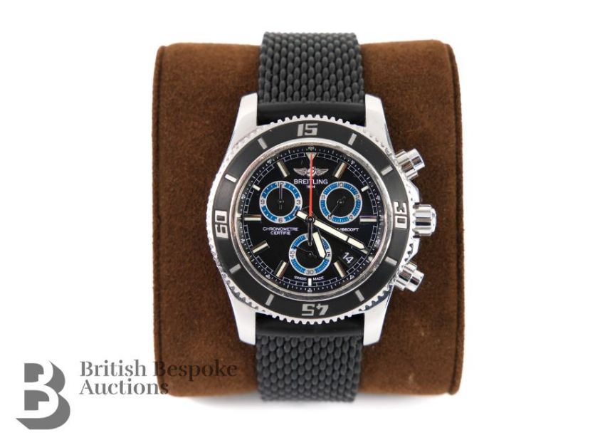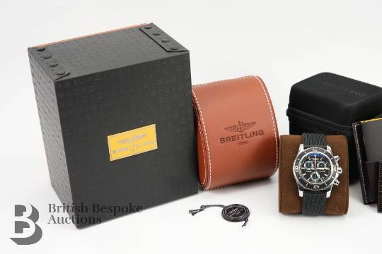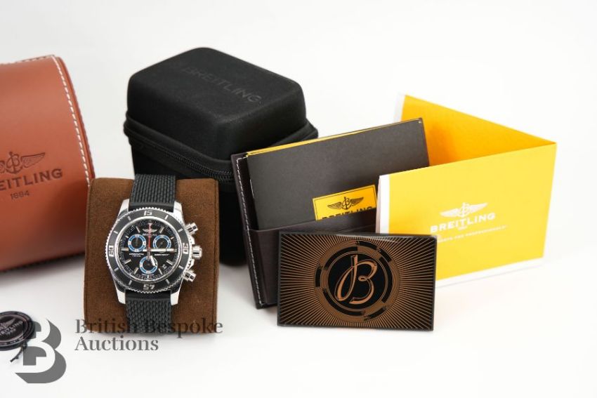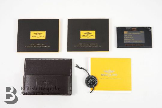 2018 Breitling SuperOcean M2000/ 151112 chronograph divers watch. The watch having a black bezel and face with bright blue sub-dials, case measuring 46 mm, reference A73310A8-BB74. The watch presented on a Breitling black rubber strap, 26 cms. The watch complete with certificate, International Warranty card and instruction manual, presented in a tan leather case, outer case and sleeve, also with a Breitling Travel Case.