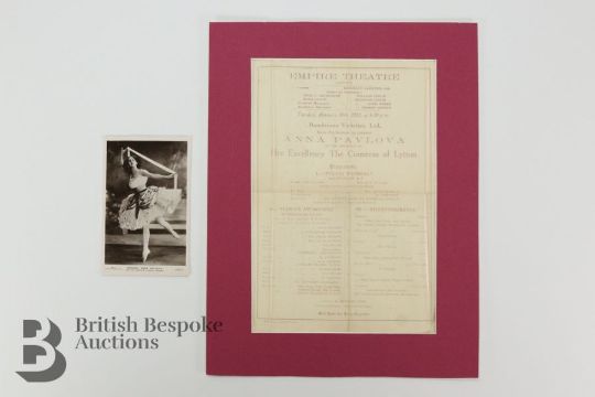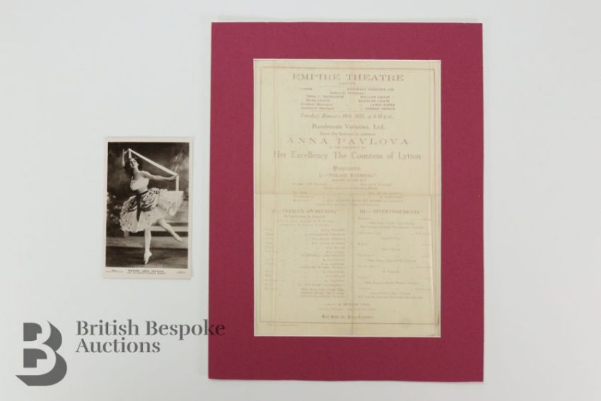 Rare silk ballet programme, Anna Pavlova performing at The Empire Theatre Calcutta, India, Tuesday January 16th 1923 featuring Anna Pavlova in the Presence of Her Excellency The Countess of Lytton, the programme included the Polish Wedding, Flora's Awakening and III Divertissements, 18.3 x 27.3 cms. This lot includes a black and white photographic print of Anna Pavlova in her most notable roll Dying Swan, laid on board, indistinct signature across the body approx 19.5 x 25 cms.