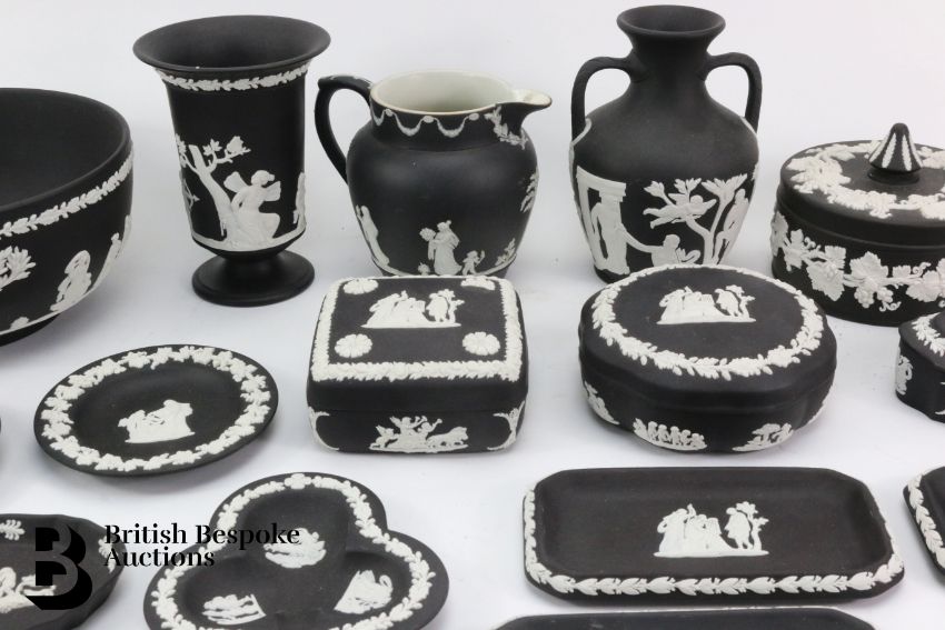Wedgwood Black Basalt Jasper Ware including fruit bowl 20 x 10 cms with a classical frieze, circular lidded dish decorated with vine leaves, creamer approx. 11cms, footed vase approx. 15cms, square trinket box, rectangular trinket box, circular trinket box, cup and saucer, twin handled vase with classical frieze, three pin dishes,  candle stick holder, egg cup, three rectangular trinket dishes (one marked Pullman Kellogg - Eho April 1976, to commemorate a backlog of two million manhours), and small vase in the form of a classical jardiniere. (20)