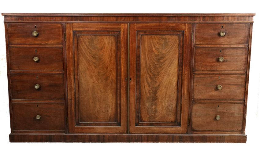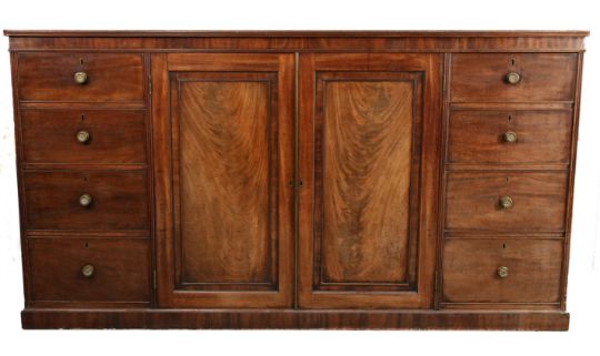 Mahogany dwarf linen cupboard, George III, circa 1810, in the manner of Gillows, with a pair of panelled doors enclosing slides, flanked by four drawers on either side, approx 107 h x 198 cms w.