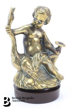 An unusual Edwardian brass motor car radiator mascot featuring a cherub (putti) riding a swan, approx  cms.