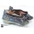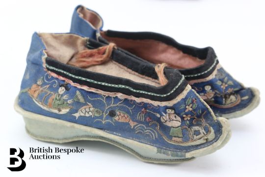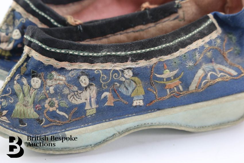 Pair of Chinese silver slippers, royal blue embroidered with figures in silk and gold thread, approx 14 cms together with an unusual Chinese silk slipper stand, with red silk embroidered with blue flowers, approx 38 cms h.