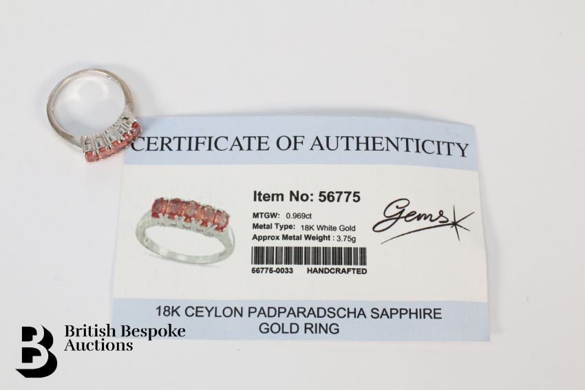 18ct white gold celone padparadscha sapphire ring, set with five 5 x 3mm oval sapphires, approx. 0.96cts, size N. approx. 4.1gms. With certificate.