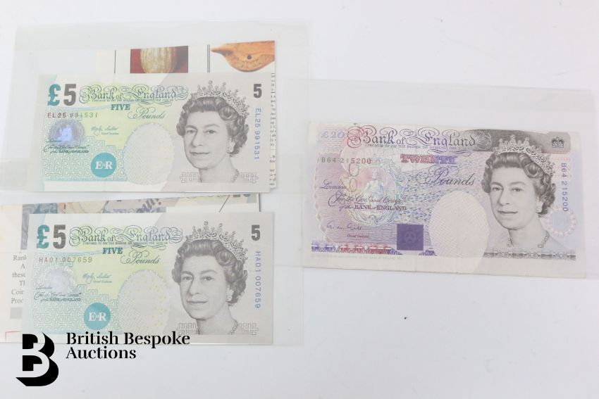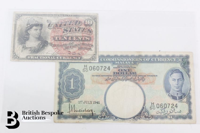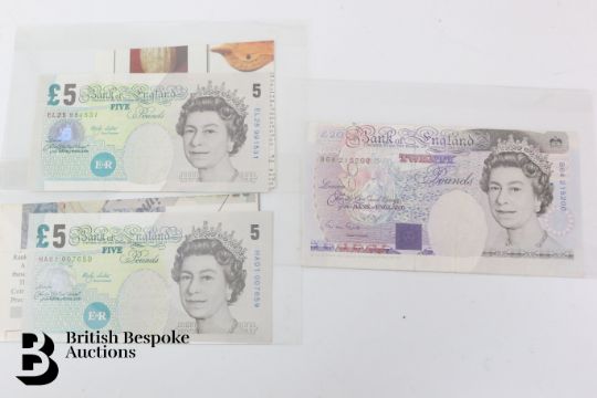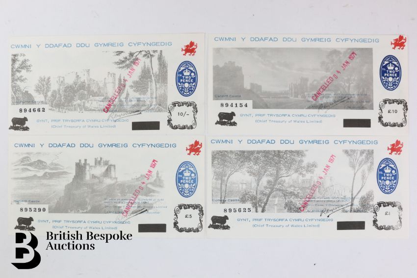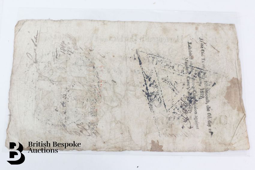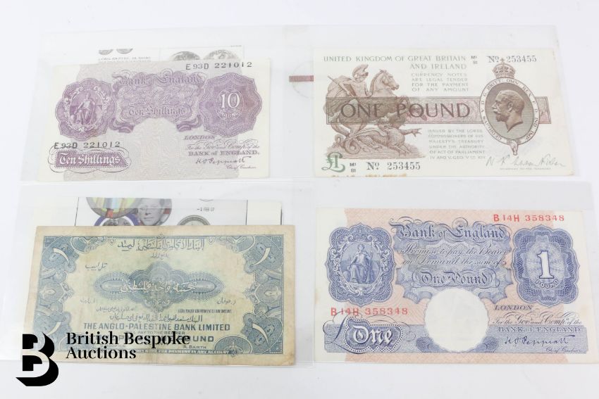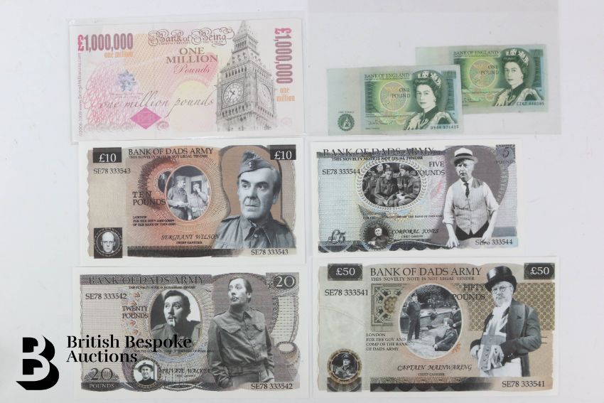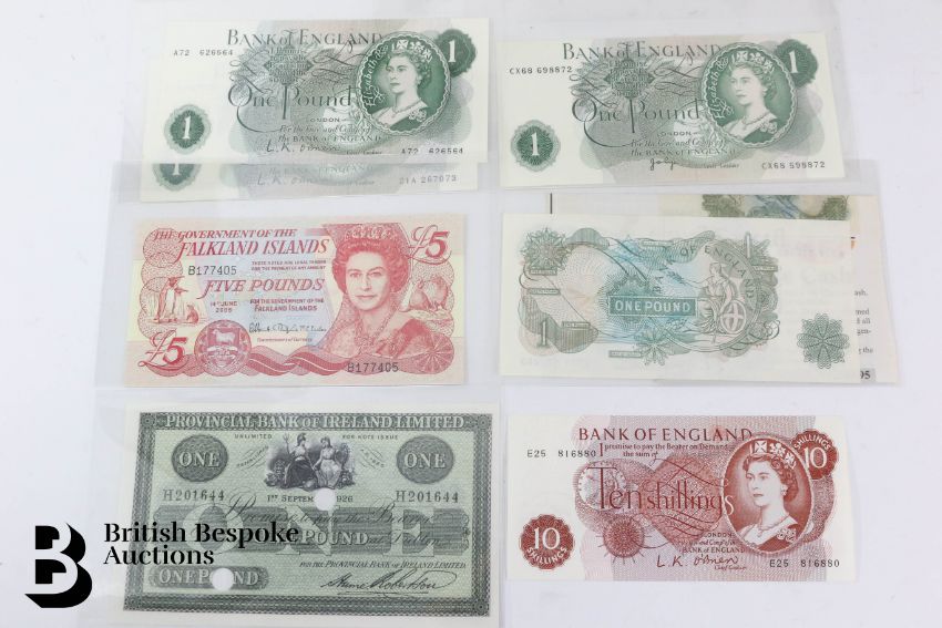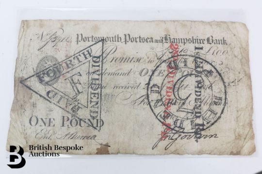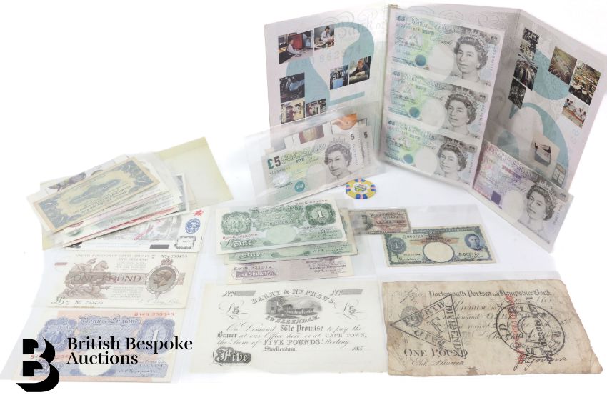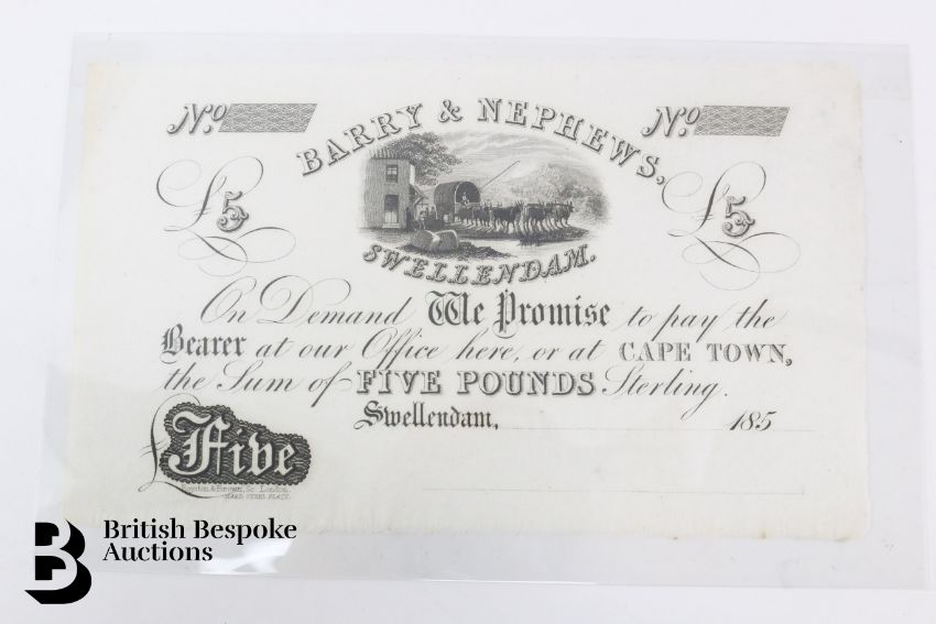 Collection of promissory note, Barry & Nephews Swellendam South Africa promissory note for the sum of £5.00 and a 1819 Portsmouth, Portsea and Hampshire Bank £1.00 promissory note, Provincial Bank of Ireland £1 promissory note; together with a quantity of GB bank notes including Anglo-Palestine pound note, Welsh notes, Falklands Islands £5.00 note, two £5.00 notes, £1.00 bank notes x 5, 10 shilling note, 10 shillings, two £1.00 note, blue £1.00 pound note, United Kingdom £1.00 note, £20.00 note, miniature £1.00 notes and Bank of Dad's Army notes.