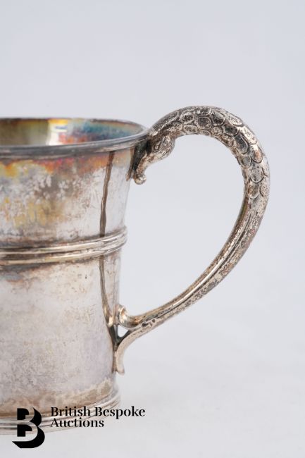 Silver christening mug, London dated 1950, mm Guild of Handicraft Chipping Campden. The cup having a girdle around the middle with a serpent c-scroll handle, approx 7.5 cms h, approx 213.6 gms.