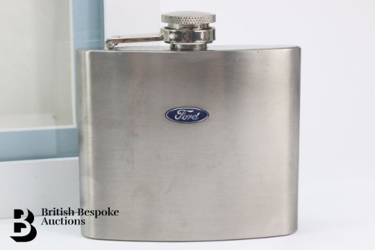A framed and glazed display of all that remains of Ford Anglia from the late 1950s; the Anglia chrome bodyscript, AA badge and AA box key, together with an unused Ford owner's hip flask.
