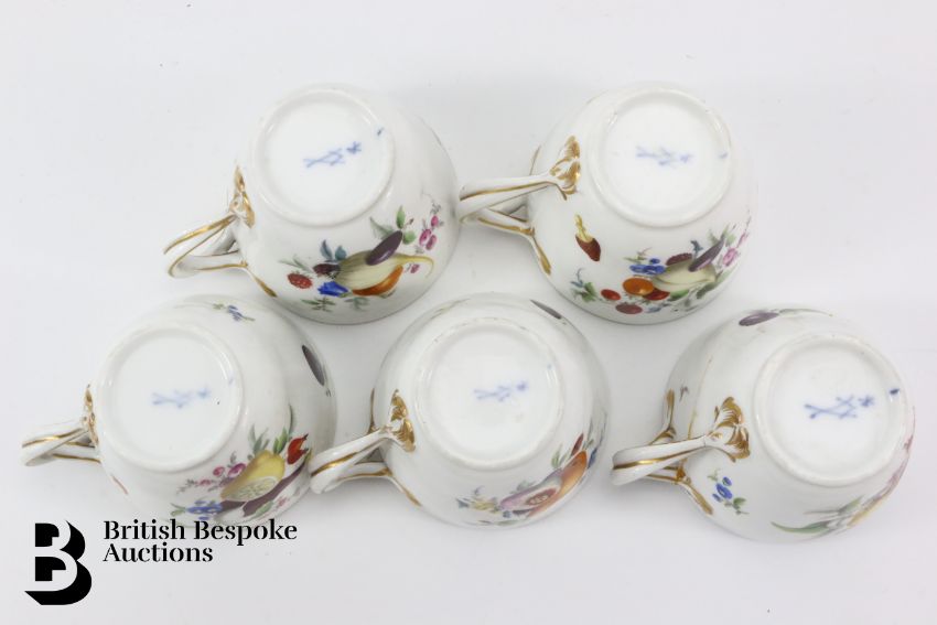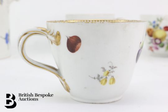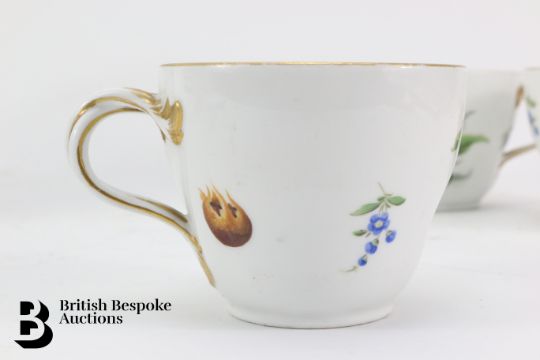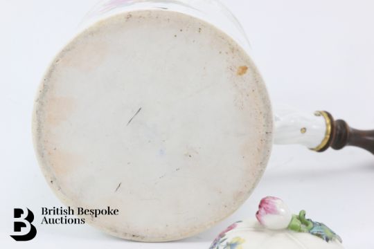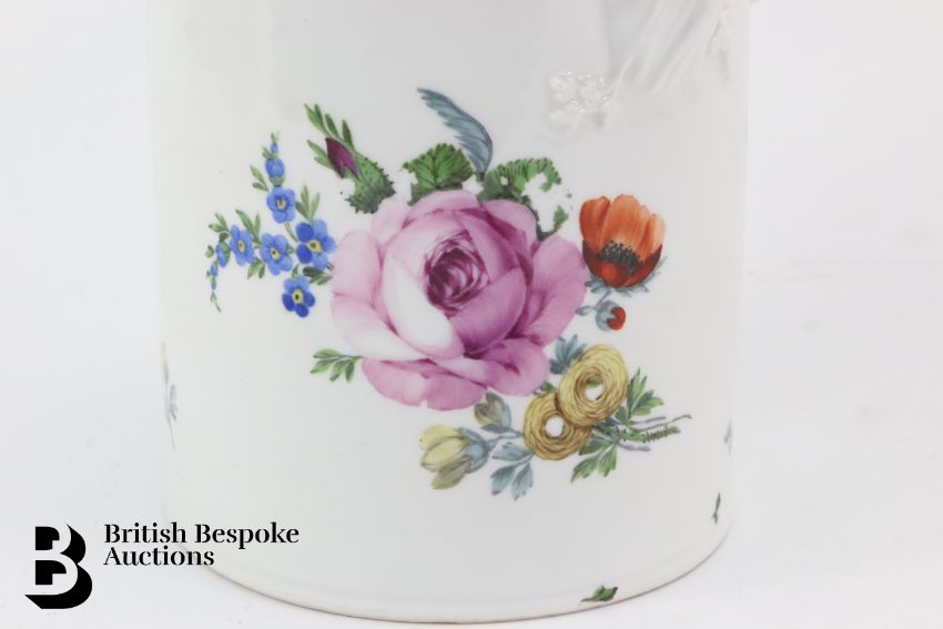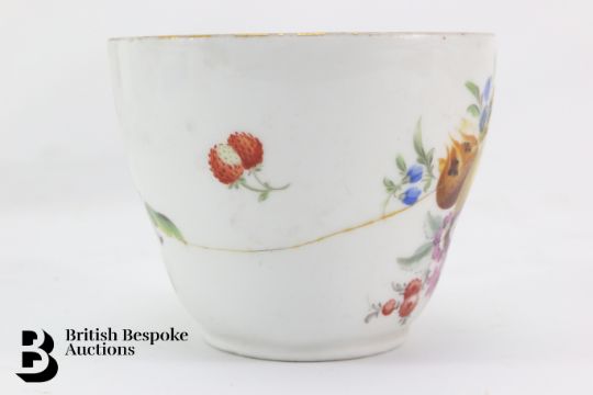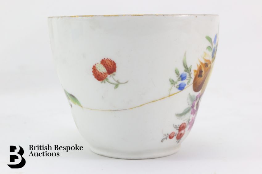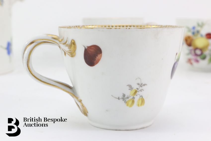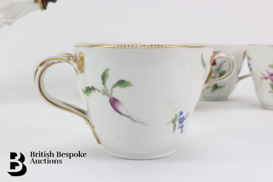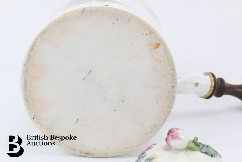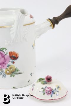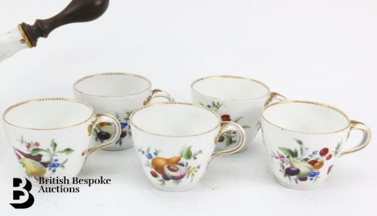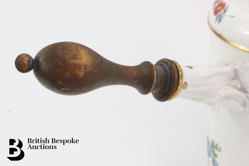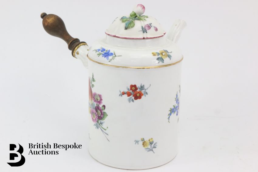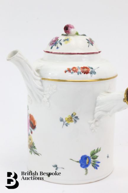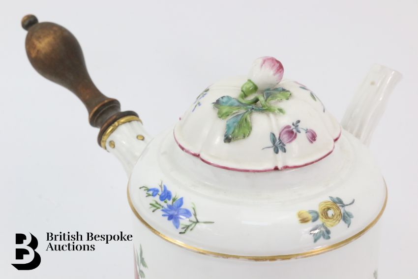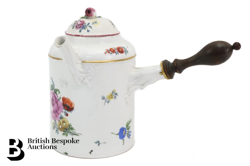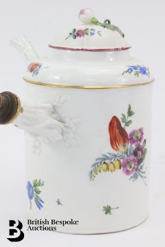 Meissen porcelain hot chocolate pot and cover, circa 1774 onwards, cylindrical form, fixed at the side with a naturalistic turned wood handle, painted with a floral spray and sprig, the cover having a rose bud finial, very faint crossed swords in underglaze-blue, approx 19 cms h. This lot includes four 18th century Meissen cups each painted with flowers and fruit, heightened with gilt approx 63mm height.