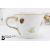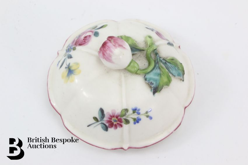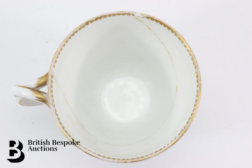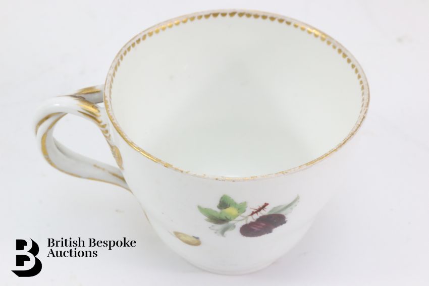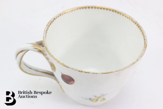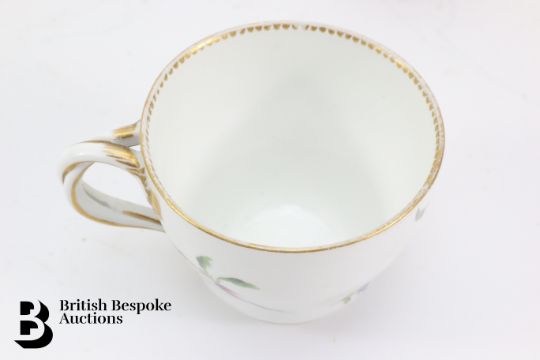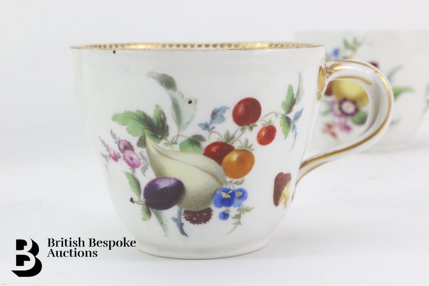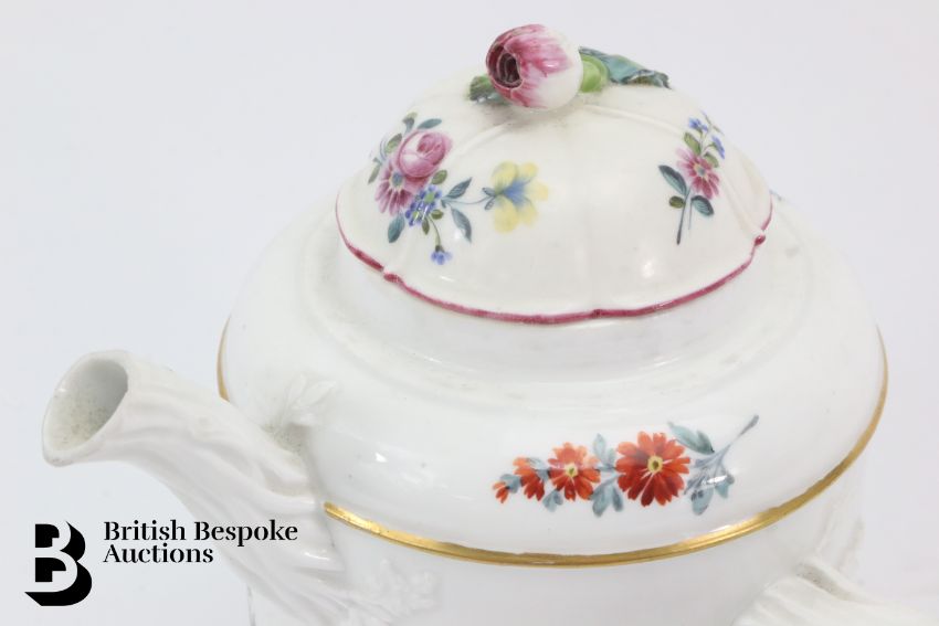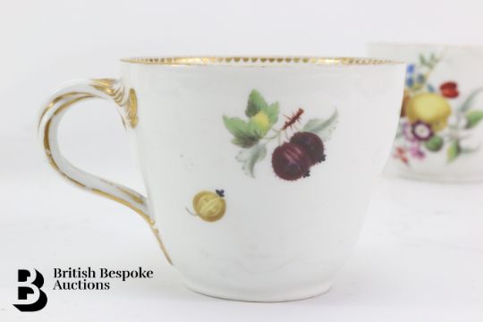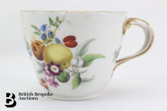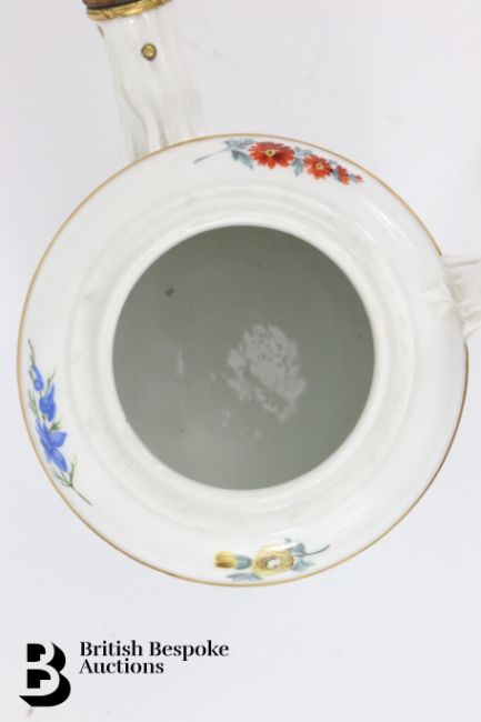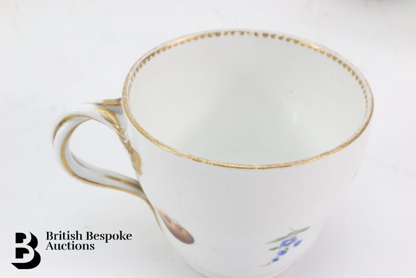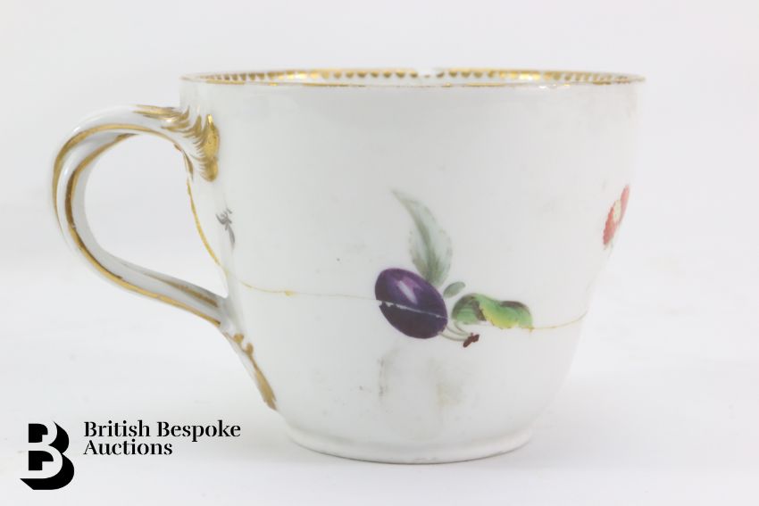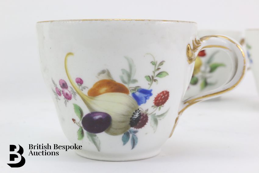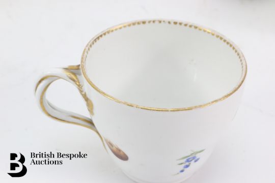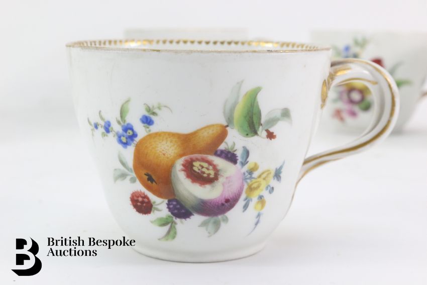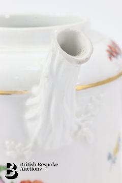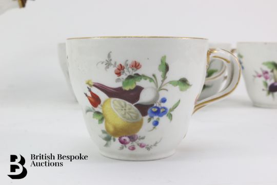 Meissen porcelain hot chocolate pot and cover, circa 1774 onwards, cylindrical form, fixed at the side with a naturalistic turned wood handle, painted with a floral spray and sprig, the cover having a rose bud finial, very faint crossed swords in underglaze-blue, approx 19 cms h. This lot includes four 18th century Meissen cups each painted with flowers and fruit, heightened with gilt approx 63mm height.