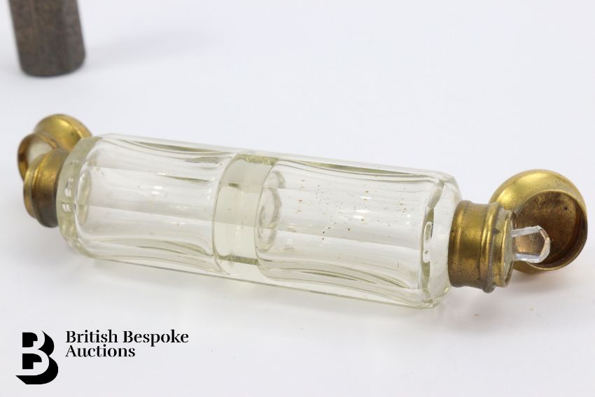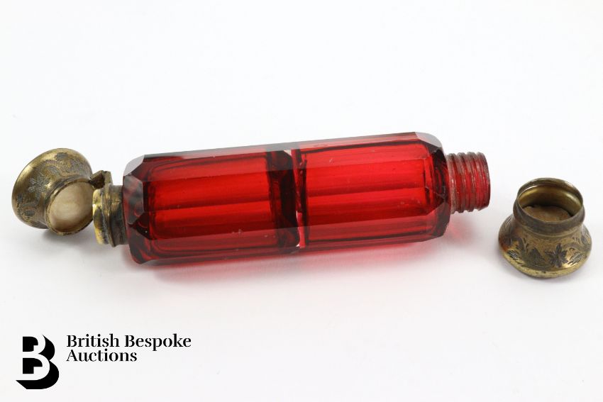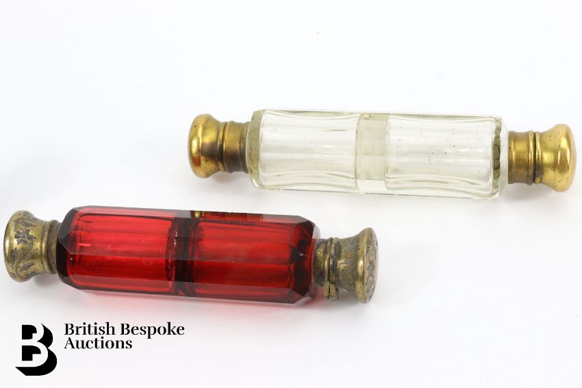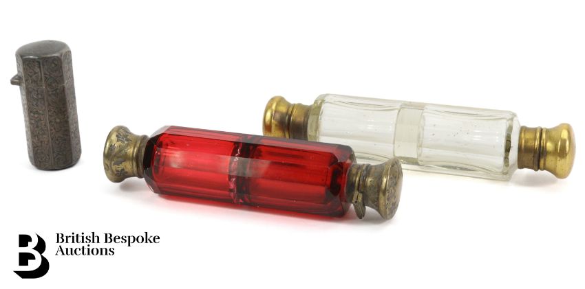 Two Victorian cut-glass double scent bottles, one clear and the other cranberry, approx 12 and 13.5 cms in length.