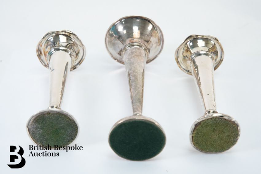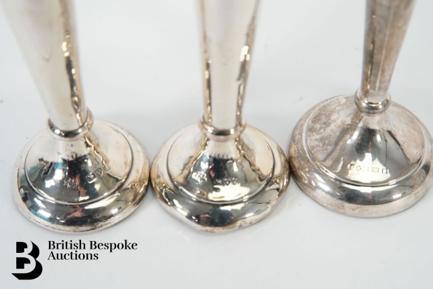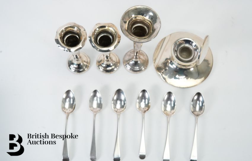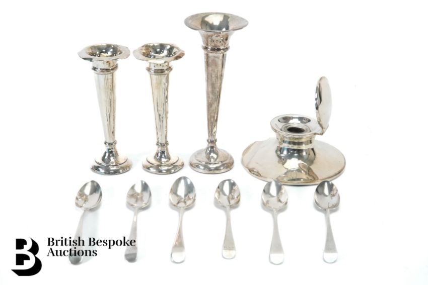 Miscellaneous silver, including three silver bud vases (various hallmarks), silver travelling inkwell Birmingham (marks rubbed), six silver coffee spoons.