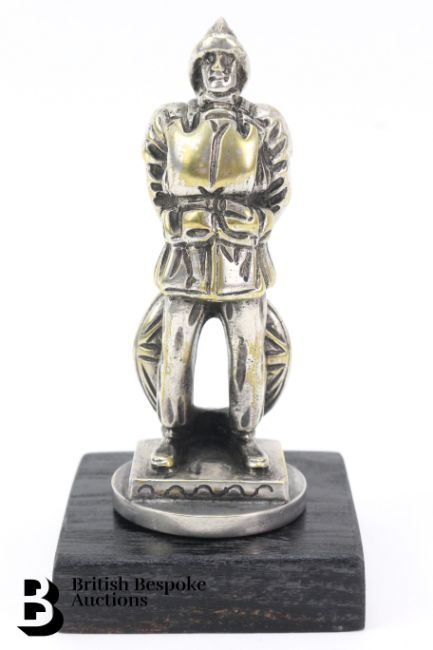 Silver plated on brass 1920's accessory mascot, featuring a standing lifeboatman, in his uniform, holding a life belt behind him, marked G.U Macdougald and numbered, approx 15cms.