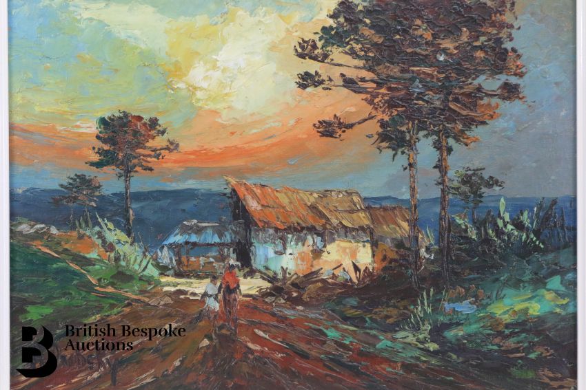 Anna Dubsky, 20th century (Austrian), two Latin American oil on canvas, landscape with cottages at sunset, both signed lower left, approx 38 x 28 cms, framed.