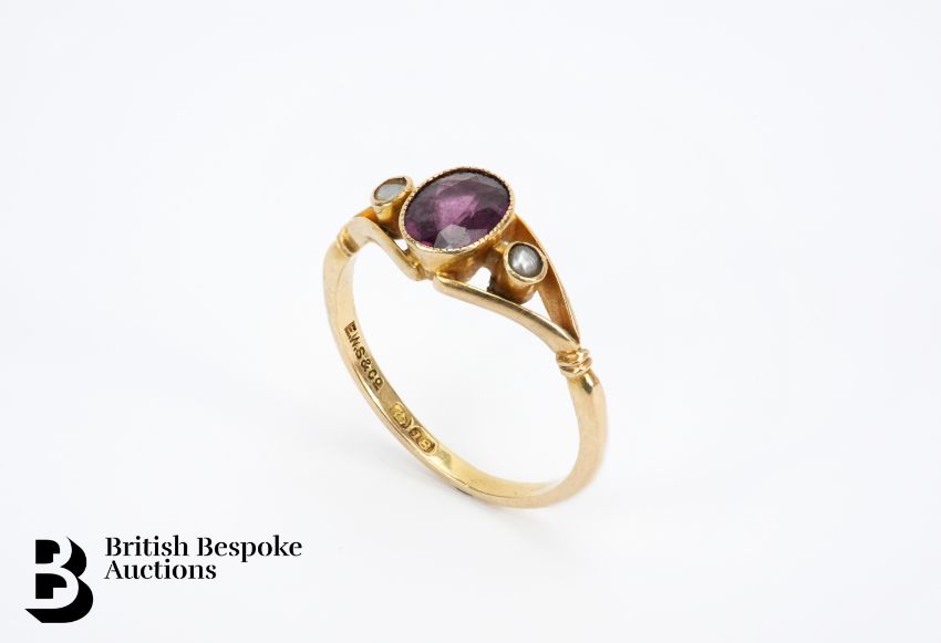 18ct gold amethyst and pearl ring, the oval amethyst measures 7 x 5mm, size O, approx 2.63 gms.