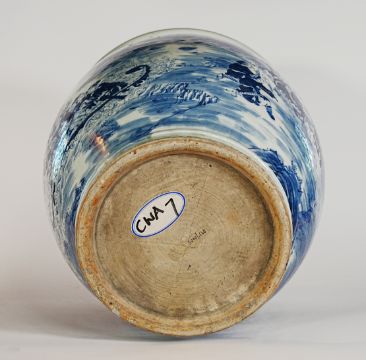 Chinese blue and white jardiniere, 19th Century, 40 x 36 cms. The jardinière profusely decorated with a continuous scene of warriors preparing for battle. The anterior of the jardinière depicts two figures paying allegiance to the commander in chief (衰. shuāi) and the opposing side depicting warriors approaching on warships. (cr) Provenance: Sudeley Castle & Gardens, Winchcombe, Gloucestershire. Condition Report * vertical crack approx 23 cms and another hairline crack to the base, dimpling to the base.
