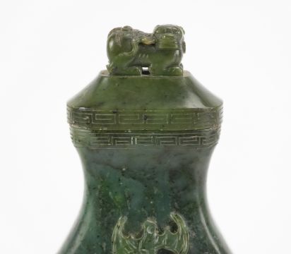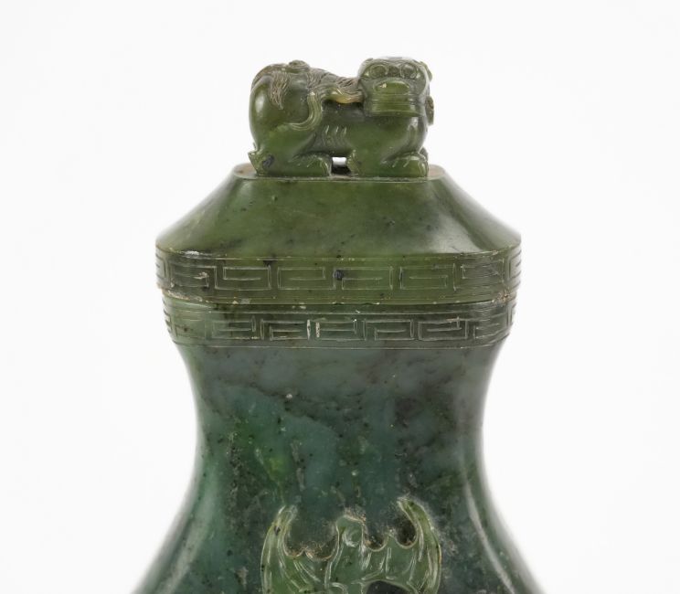 Chinese spinach mottled jadeite double vase, the tapering vase beside a hollow pine trunk with trailing pine branches, bat and lingzhi fungus spray, approx 19 cms h the cover engraved with greek-key design and surmounted with a finely carved buddhist lion.  Provenance: The E. W. Towler Collection, formerly of Glympton Park, Woodstock, Oxfordshire.