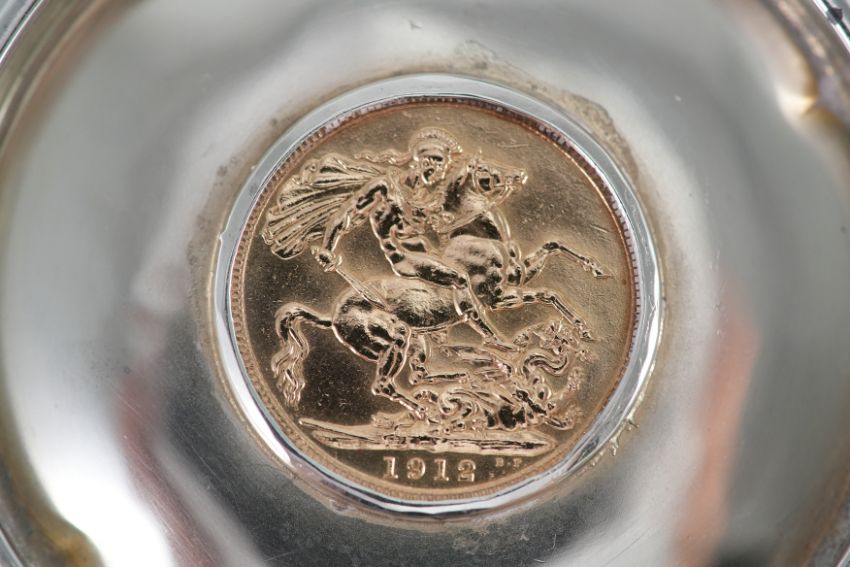 Set of four silver quatrefoil dishes, London dated 1939, mm Goldsmiths' and Silversmiths' Co Ltd, each dish inset with a George V full gold sovereign one dated 1911 and three 1912, approx 10 cms diameter, 350 gms. Provenance: Sudeley Castle & Gardens, Winchcombe, Gloucestershire.