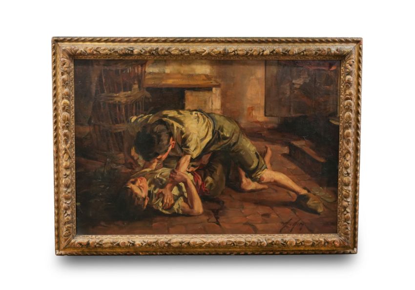 Anna Airy (1882-1964) oil on canvas, 'Boys Fighting', depicting two youngsters squabbling, approx 100 w x 150 cms, framed.  Provenance: This painting belongs to a direct descendent of Anna Airy.  Note: Born in Greenwich London in 1882, raised by her maiden aunts who were both artists. She studied at Slade School of Art (1899-1903) under Frederick Brown, Philip Wilson Steer and Henry Tonks. She was one of the first woman commissioned as a war artist and painted several large works of munitions factories. She was considered a considerable talent and leading artist of her generation. Anna exhibited at the Royal Academy in London every year bar one and participated in many International Exhibitions including Stockholm, Milan, Toronto and Montreal. She was a member of many artistic societies including an elected member of The Pastel Society, elected member of the Royal Society of Painters and Etchers, elected member of the Royal Institute of Oil Painters and a member of the Royal Glasgow Institute of the Fine Arts.