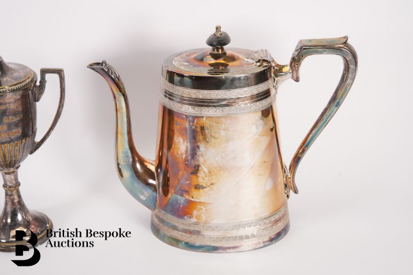Silver plated tea and coffee pot, early 20th century, Walker & Hall, both with ebony finials together with a silver plated twin-handled trophy and cover engraved R.A.F Sports 1930 Open Mile Relay. (3)