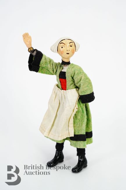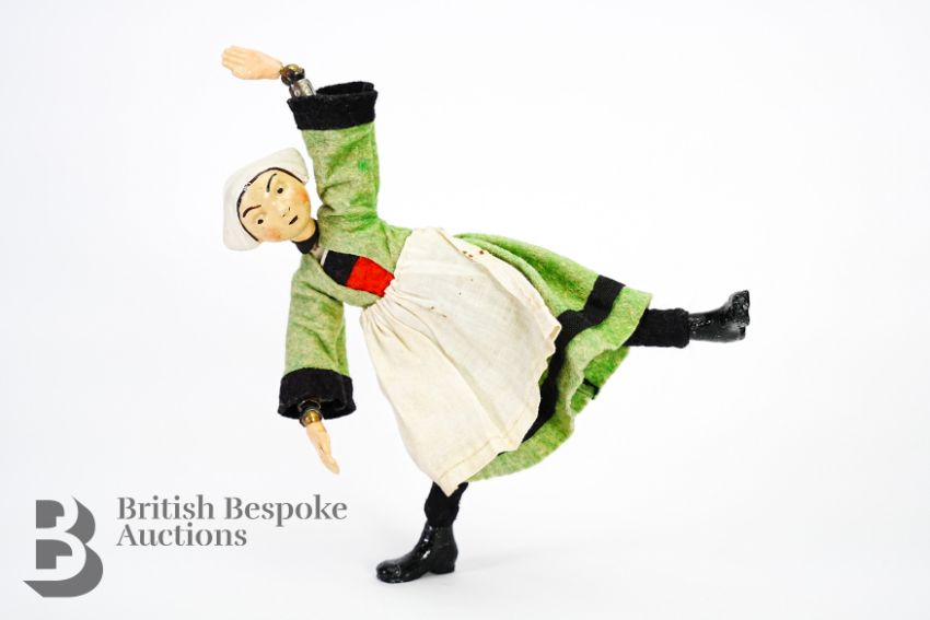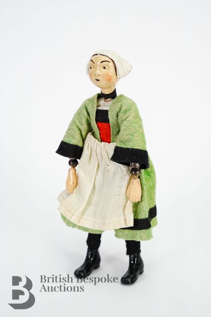 An unusual Continental doll of the French comic book character Becassine, the doll having hand painted head, hands and feet, but the limbs are crafted from metal, this doll does have age and feels very much hand made, wearing a felt costume, approx 19.5 cms in length.
