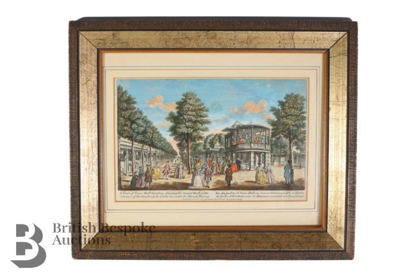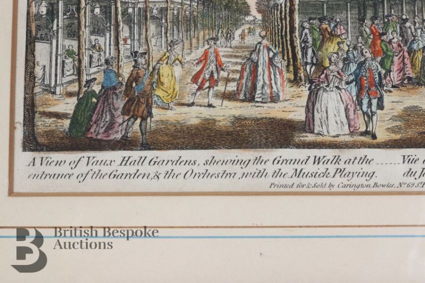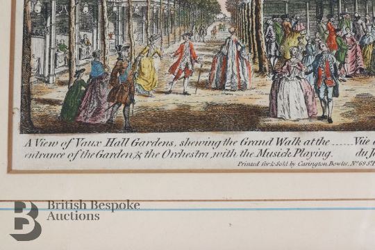 An early 19th century partial hand coloured print, entitled 'A View of Vaux Hall Gardens', titled in English and French, printed for and sold by Carrington Bowles, 69 St Paul's, Church Yard, London, approx 26 x 16.5 cms, framed and glazed.