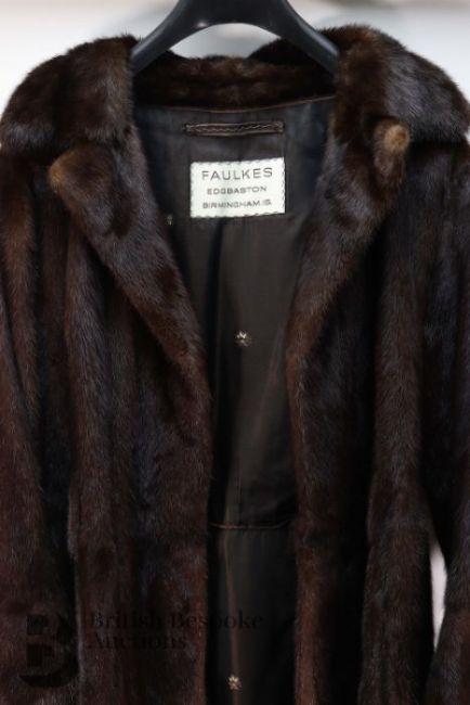 A Faulkes of Edgbaston brown 3/4 length brown mink coat, two hook and eye clasps, size 8 to 10, approx 108 cms from shoulder to hem.