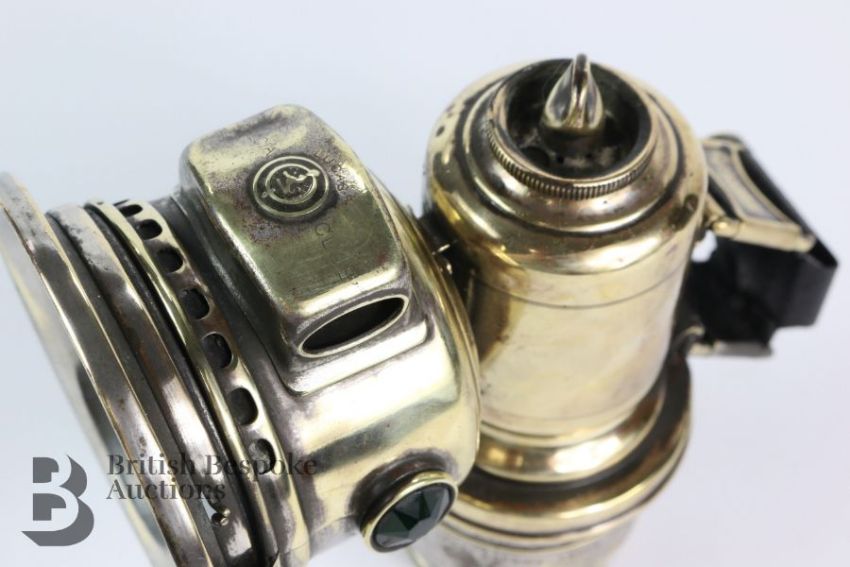 A brass Lucas King of the Road self generating acetylene headlamp 'The Calcia Club' for an early bicycle or motorcycle. Measures approx. 17cms h.