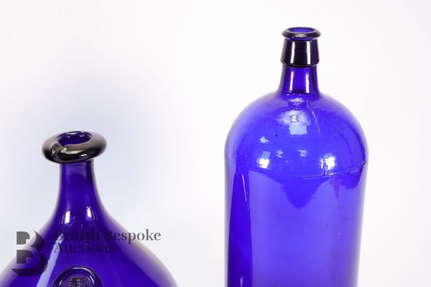 Two large Bristol blue bottles, approx 33 cms h together with a Bristol blue flat-bottomed decanter approx 24 cms.