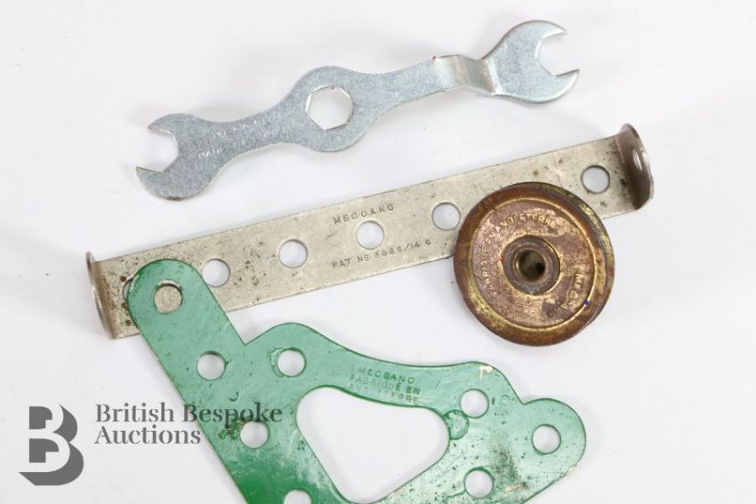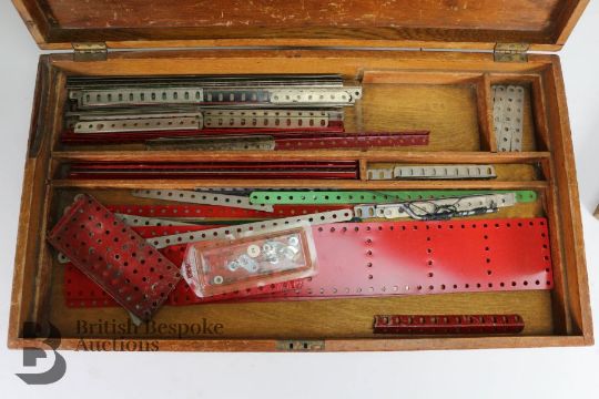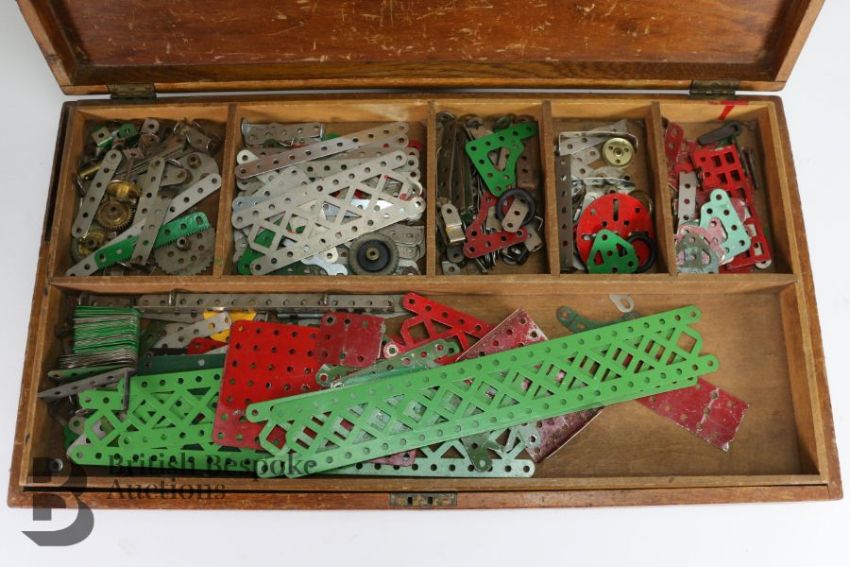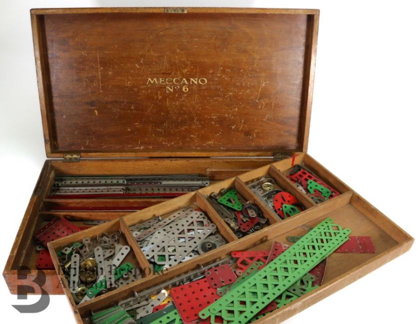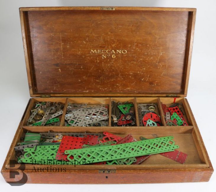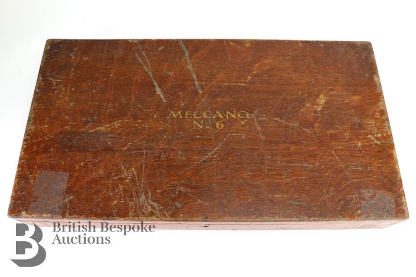 Meccano No. 6 wood box with fitted interior tray, includes various metal components.
