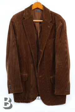 Gentleman's designer wear, including a Hugo Boss blue velvet evening jacket, size 40 (medium); Ralph Lauren brown corduroy jacket size 40 (medium); Brooks Brothers suede and wool overcoat size L, Gant USA 'The Raincoat' size L. (4)