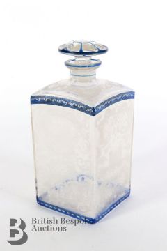 A French acid-etched and blue enamel Eau de Toilette bottle and stopper approx 21 cms h; French glass and enamel scent bottle and stopper approx 13 cms h, a French glass trinket box in the design of a nut.
