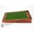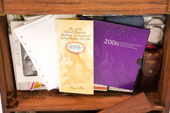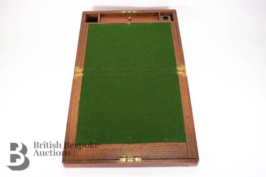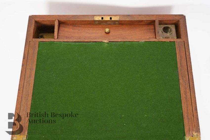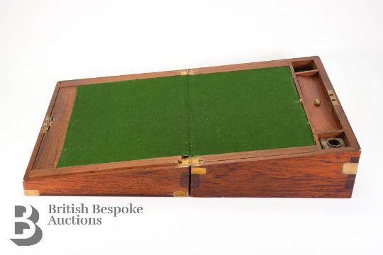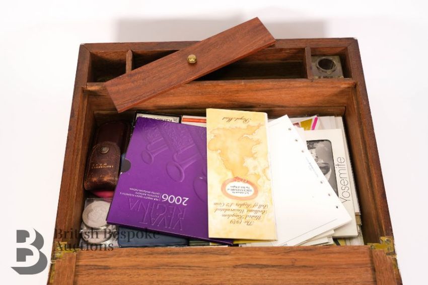 Campaign writing box, brass reinforcement, black tooled leather writing slope, containing a mother of pearl and silver letter fruit knife, quantity of playing cards x 2, Leatherman Wave utility knife, Post-It notes and various unused cards and a quantity of coins including Queen Victoria 1890 silver crown, eight other commemorative crowns, Britain's First Decimal Coins and a 1989 United Kingdom Uncirculated Bill of Rights £2 coin.