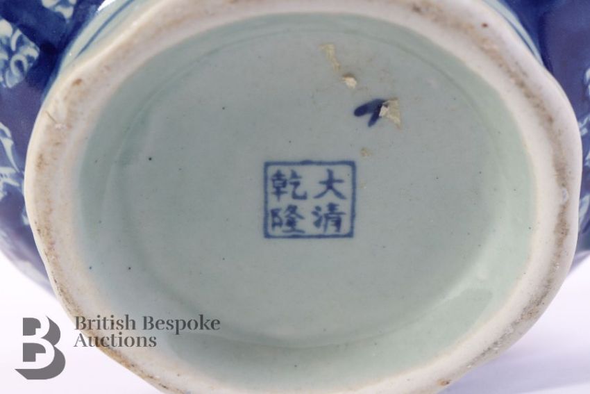 Blue and white porcelain including a Chinese pitcher approx. 20cms, two blue and white pots and covers approx. 16cms, and a Canton Collection milk jug approx. 22cms.