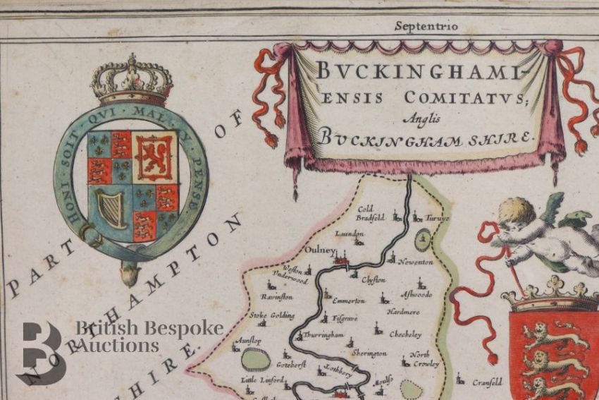 Johannes Blaeu - county map, Buckinghamshire Ensis Comitatus Anglis, approx 28 x 43 cms, framed and glazed, with contemporary outline colouring.