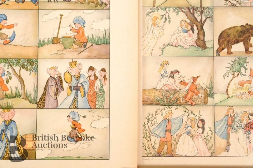 Three vintage children's books, including a German fairytale illustrated folio entitled 'Deutsche Marchen', containing 20 illustrated sheets of Grimm's tales and children's verse published by E.A Schwerdtfeger & Co Berlin approx 30 x 43 cms; a JigPuzBuk entitled 'Robin's Jigsaw Story Book, printed and published by John Leng & Co and a copy of Tip & Top on the Farm pop-up book, published by Bancroft & Co London printed in Czechoslovakia. (3)