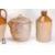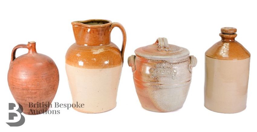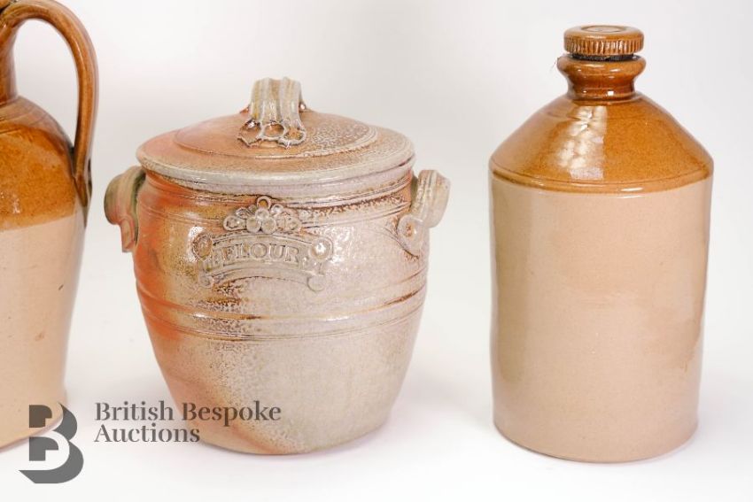 French earthenware including a large two-toned jug approx 39 cms, a large flour pot and cover 26 cms, a two-toned flask and stopper 39 cms h and a terracotta wine/oil flask approx 30 cms h. (4)