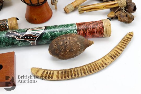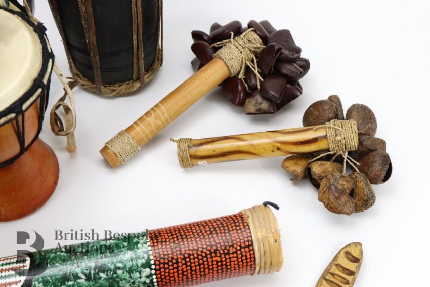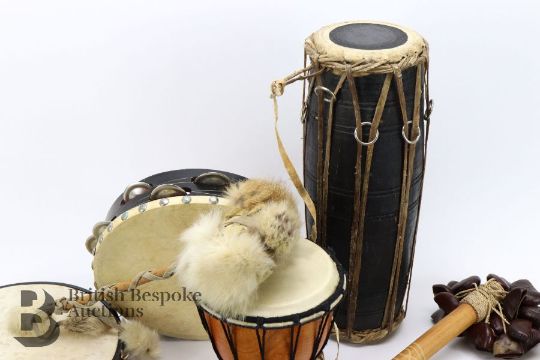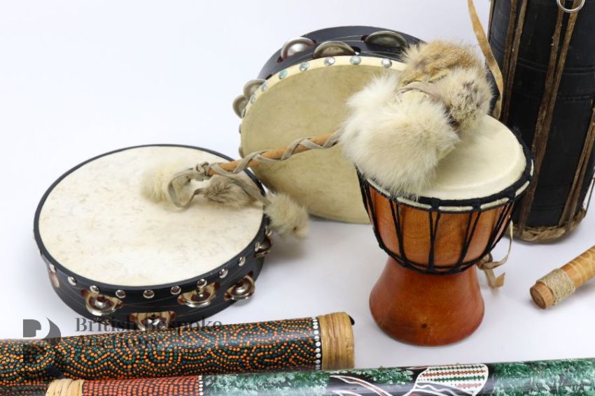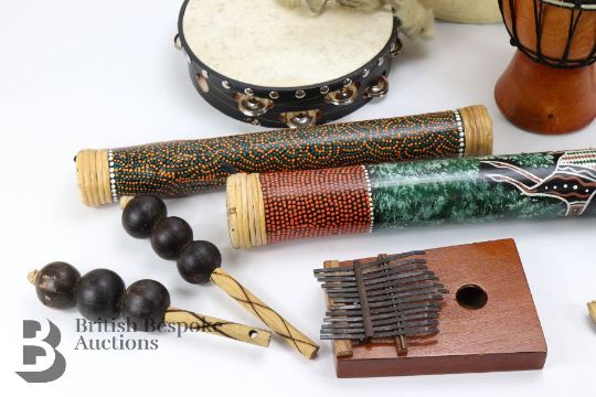 Quantity of percussion instruments, including rain shaker sticks, tambourines, thumb piano, waterfall nutshell shakers, shakers, small drums, plus an harmonica, tin whistle, recorder and treble recorder, wonderful fun for children.