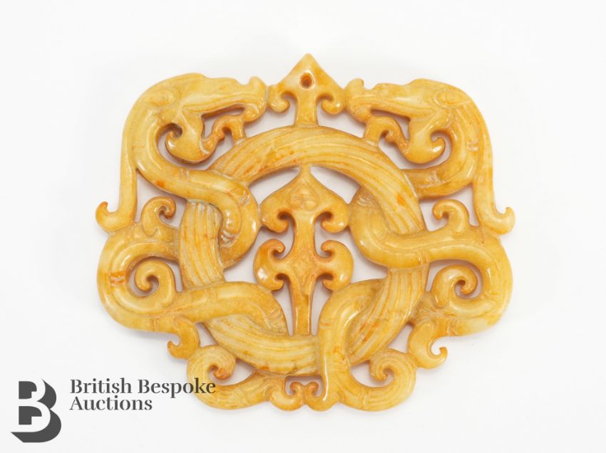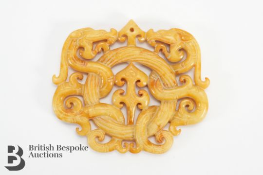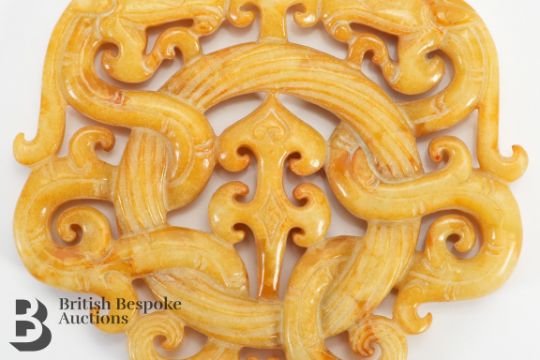 Chinese yellow/brown jade amulet, circular form, open work carving symbolising entwined dragons, approx 8 x 6.2 cms.