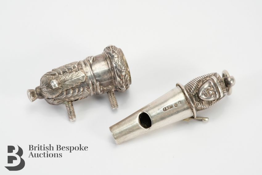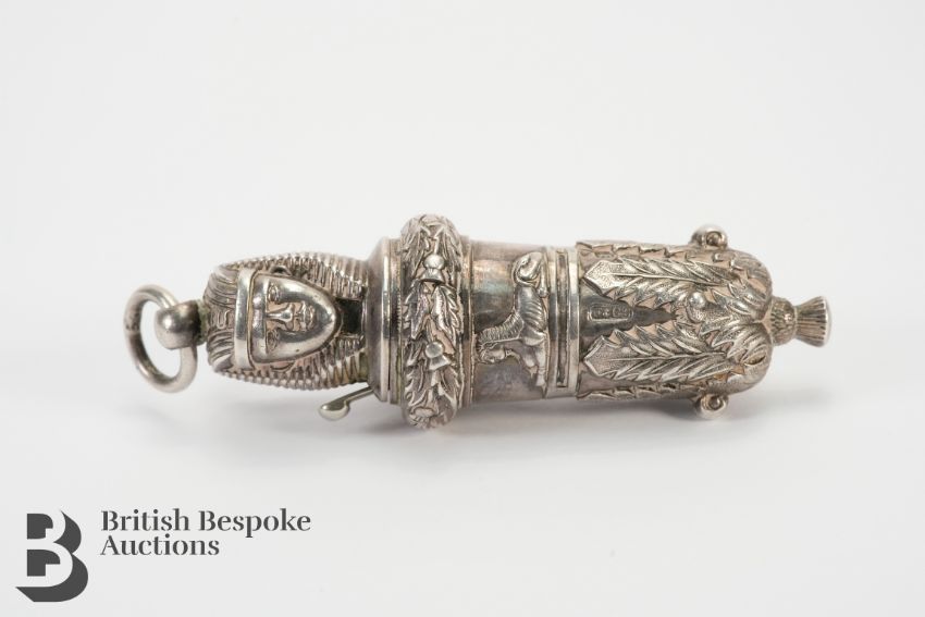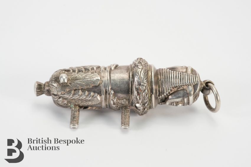 A silver Victorian Glorious Glosters officers whistle, dated 1882, mm Joseph Jennens & Co the case moulded with the Glosters Sphinx emblem and acanthus leaf, 41.7 gms.