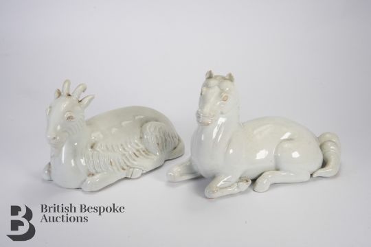Two Chinese Blanc de Chine figures, the first is a seated horse, with detailing to the mane and tail, approx 23 x 15 cms together with a seated goat, with detailing to the coat, horns and tail, both with expressive faces.