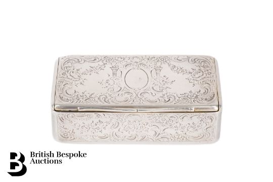 Victorian silver table snuff box, London hallmark dated 1838, mm Charles Rawlings & William Summers. The snuff box having foliate engraving with vacant cartouche and a gilded interior, approx 8.3 x 4.3 cms, approx 100 gms.