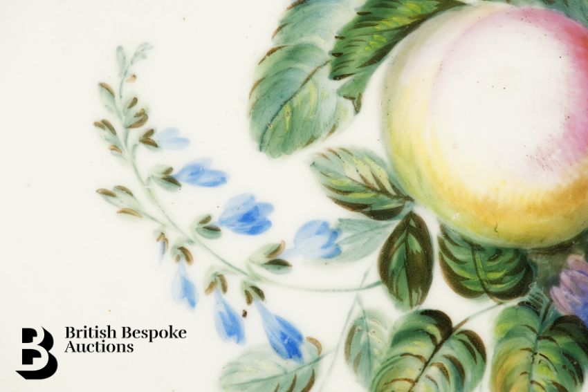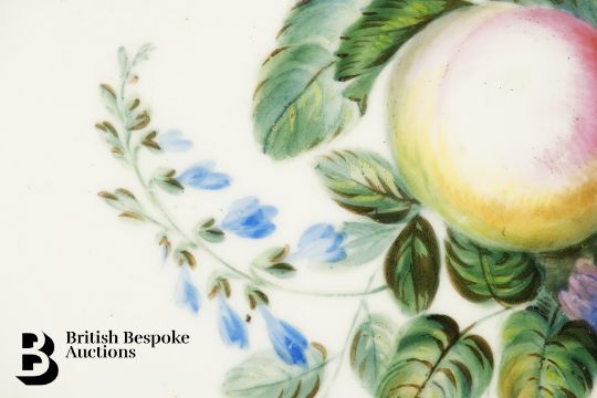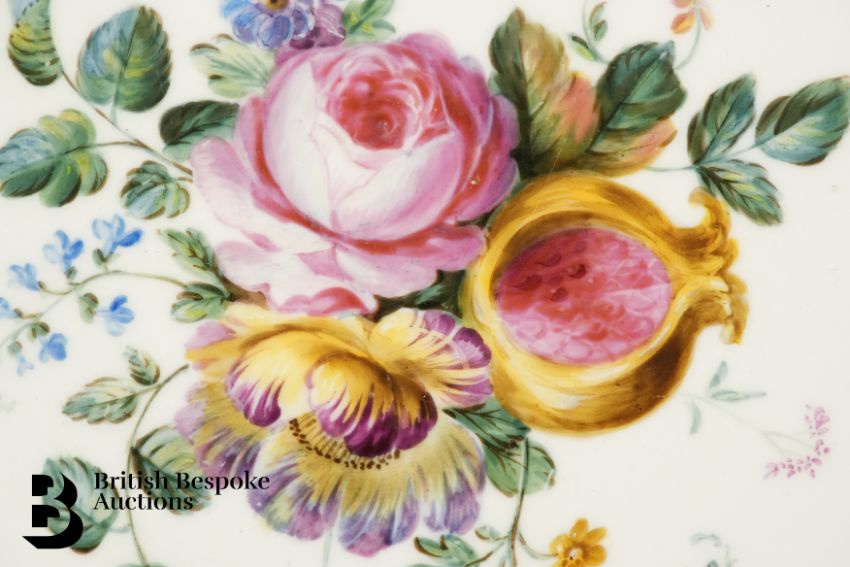 Two French Sevres cabinet plates, circa 1770. The central reserve painted with flowers and fruit, enclosed by a turquoise blue border with three floral panels heightened with gilt, a label to verso mentions Armand as decorator, blue interlaced L's with date letter R, approx 24 cms diameterCondition ReportBoth plates are in very good overall condition. The white porcelain ground is uncrazed, inner gilded boarders have slight rubbing - one has a small area of loss. The green ground is good with little wear, each floral panel is still bright, with gilding clean and bright. The backs of the plates show grit from the firing process, good clear factory marks. This condition report is an expression of our opinion only.